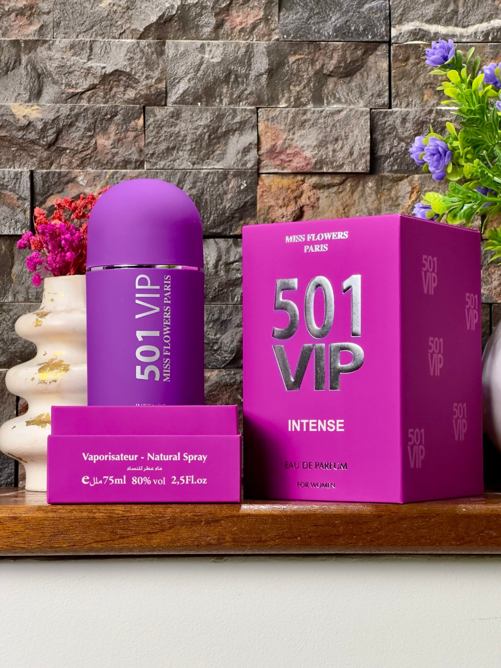 Miss Flowers 501 Intense للنساء هو عطر شرقي زهري يتميز بمزيج من الانتعاش الأخضر، قلب خشبي مكثف، وقاعدة دافئة وجذابة، يجمع بين الانتعاش والحسية، ويقدم تجربة عطرية فريدة للمرأة التي تبحث عن الفخامة والتميز في رائحة تدوم طويلاً.